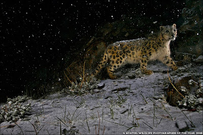 پلنگ گربه وحشی بدنبال شکار در یک شب برفی جایزه بهترین عکس حیات وحش سال 2008 را به خود اختصاص داد .